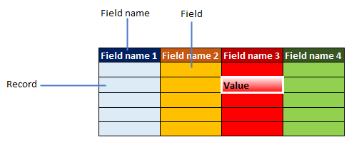 There are five main elements to any table in a database, and each of these have (somewhat inevitably) a number of names: