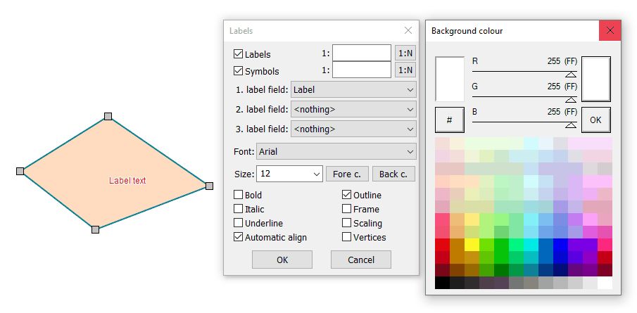 Choose a colour on the palette and fine-tune it using the RGB sliders or the # numeric colour settings panel for the frame and outline colour of the label.